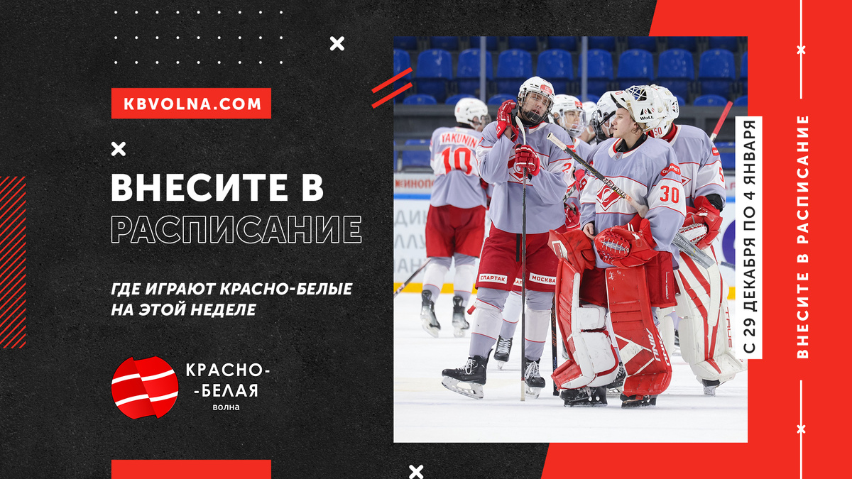 Ниже размещаем для вас памятку, чтобы ничего не забыть. Континентальная Хоккейная Лига. 4 января 17:00. ХК «Торпедо» - ХК «Спартак» Продолжаем выездную серию из 12 матчей. Экватор пройден, и скоро мы увидим команду на домашней арене. А первая игра в 2026 году пройдёт в Нижнем Новгороде. Вперёд, «Спартак»! «Красно-Белая Волна» в социальных сетях. Радио Верного Болельщика «Спартака» Наше Приложение для Android Акции и промо-коды для наших подписчиков Мы в Телеграме Наша группа в VK Мы в Youtube Наш Rutube