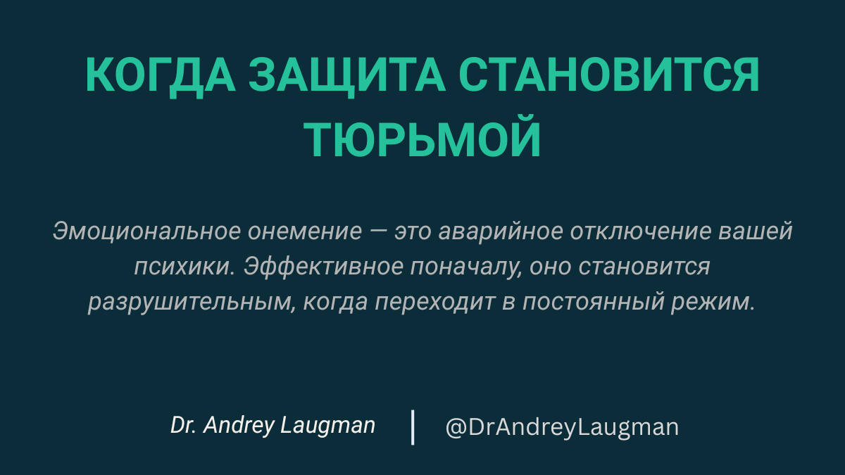 Эмоциональное онемение — это аварийное отключение вашей психики. Эффективное поначалу, оно становится разрушительным, когда переходит в постоянный режим. Онемение — это потеря способности чувствовать: радость, интерес и близость становятся недоступными независимо от обстоятельств. Нервная система отключила обработку эмоций, чтобы пережить боль, которая однажды превысила все пороги переносимости. Это была защита. Проблема в том, что «предохранитель» остался заблокированным в выключенном положении навсегда. Многие путают онемение с депрессией, но депрессия — это состояние настроения, а онемение — защитное отключение. Другие считают человека холодным, отстраненным или вовсе равнодушным. Кто-то верит, что вернуть чувства поможет сила воли — стоит просто «решить» чувствовать, и эмоции вернутся по команде. Самое вредное искажение: интерпретировать бесчувствие как доказательство того, что травма была не такой уж серьезной. Не распознавая онемение как травматическую реакцию, клиницисты часто л