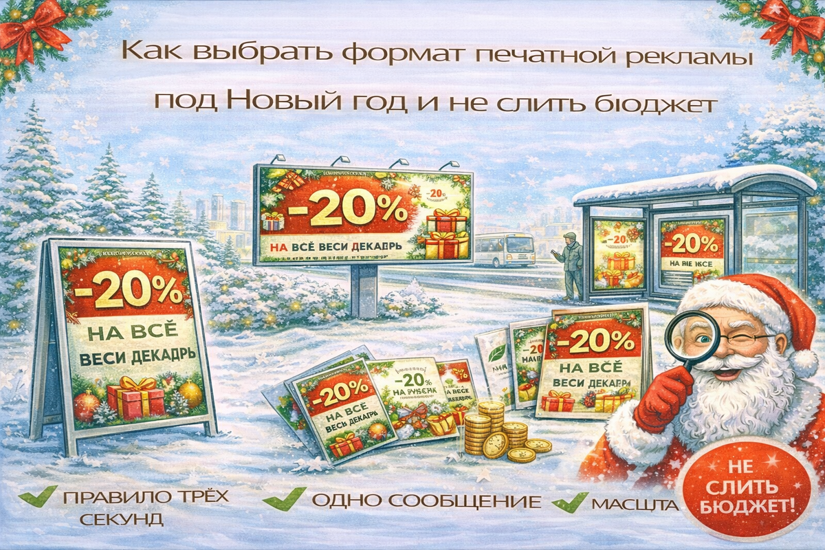 Новый год — один из самых активных периодов для офлайн-бизнеса. Поток клиентов растёт, решения принимаются быстрее, а конкуренция за внимание усиливается в разы. Именно в это время многие предприниматели допускают одну и ту же ошибку — заказывают печатную рекламу «на всякий случай», не понимая, какой формат действительно нужен под сезонные задачи. В результате деньги тратятся, материалы печатаются, но эффекта либо нет, либо он значительно ниже возможного. Разберём, как выбрать формат печатной рекламы под Новый год осознанно и с пользой для бизнеса. Перед Новым годом бизнесы часто копируют друг друга. Все делают листовки, плакаты и наклейки, не задумываясь, зачем именно. Но формат работает только тогда, когда соответствует задаче. Один и тот же носитель может быть эффективным для одного бизнеса и бесполезным для другого. Первый шаг — понять, что именно вы хотите получить от новогодней рекламы.