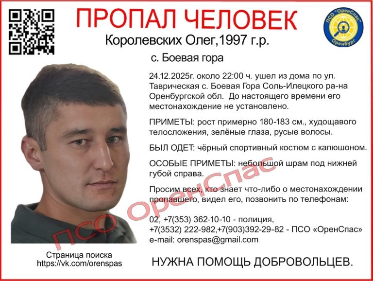 В Оренбургской области сотрудники полиции и волонтёры ПСО «ОренСпас» устанавливают местонахождение жителя Соль-Илецкого округа. Олег Королевских 1997 года рождения пропал 24 декабря 2025 года. Около 22 часов он ушел из дома по улице Таврической села Боевая Гора и не вернулся. До настоящего времени местонахождение мужчины не установлено. Приметы: рост примерно 180-183 см, худощавого телосложения, зелёные глаза, русые волосы. Был одет: чёрный спортивный костюм с капюшоном. Особые приметы: небольшой шрам под нижней губой справа. Всех, кто видел пропавшего или что-либо знает о его местонахождении, просят позвонить по телефонам:02, +7(353) 362-10-10 — полиция, +7(3532) 222-982,+7(903)392-29-82 — ПСО «ОренСпас».