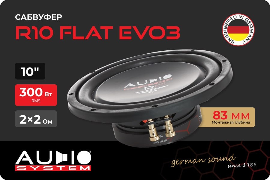 Audio System R10 FLAT EVO3. Благодаря очень небольшой посадочной глубине - всего 83 мм возможно применение в особых условиях: например корпуса-стелс или уникальные авторские решения сабвуферных коробов малой глубины. Рекомендованный объём (12 литров в ЗЯ) позволяет использовать этот сабвуфер в ограниченных возможностях по габаритам короба. Звуковая катушка 2" с номинальным импедансом 2 × 2 Ом, способна долговременно переваривать 300 Вт подводимой мощности. Диффузор изготовлен из прессованной целлюлозы, с ламинацией лицевой части. Подвес из пластичного и термостабильного бутилкаучука. Удачные конструктивные решения немецких инженеров позволили добиться качественного, артикулированного SQ-звучания этого динамика. По структуре бас плотный, с хорошим тактильным ударом. Страничка товара на российском сайте бренда: https://audiosystem-de.ru/catalog/subwoofers_i_accessories/Sabvufernye_dinamiki/ten_inches/331/