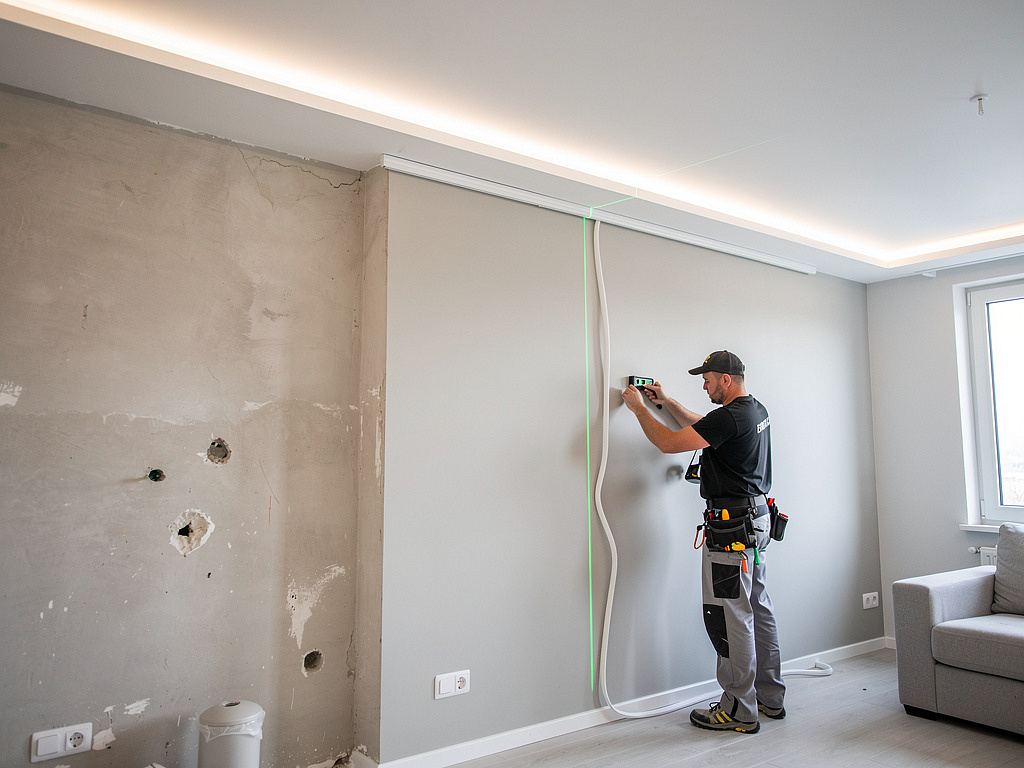 если стены "танцуют" сильнее? Тут вступают профи из нашей бригады. Используем пластиковый профиль — он гнётся, облегает изгибы, не даёт