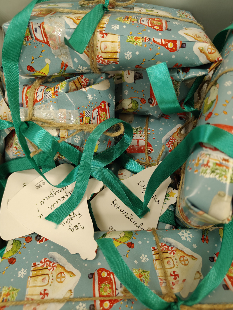 Обед очень маленький на самом деле. Ничего за него не успеваешь, ни подарки нормально завернуть, ни бантиков навязать. Ну уж что получилось, то получилось. Как