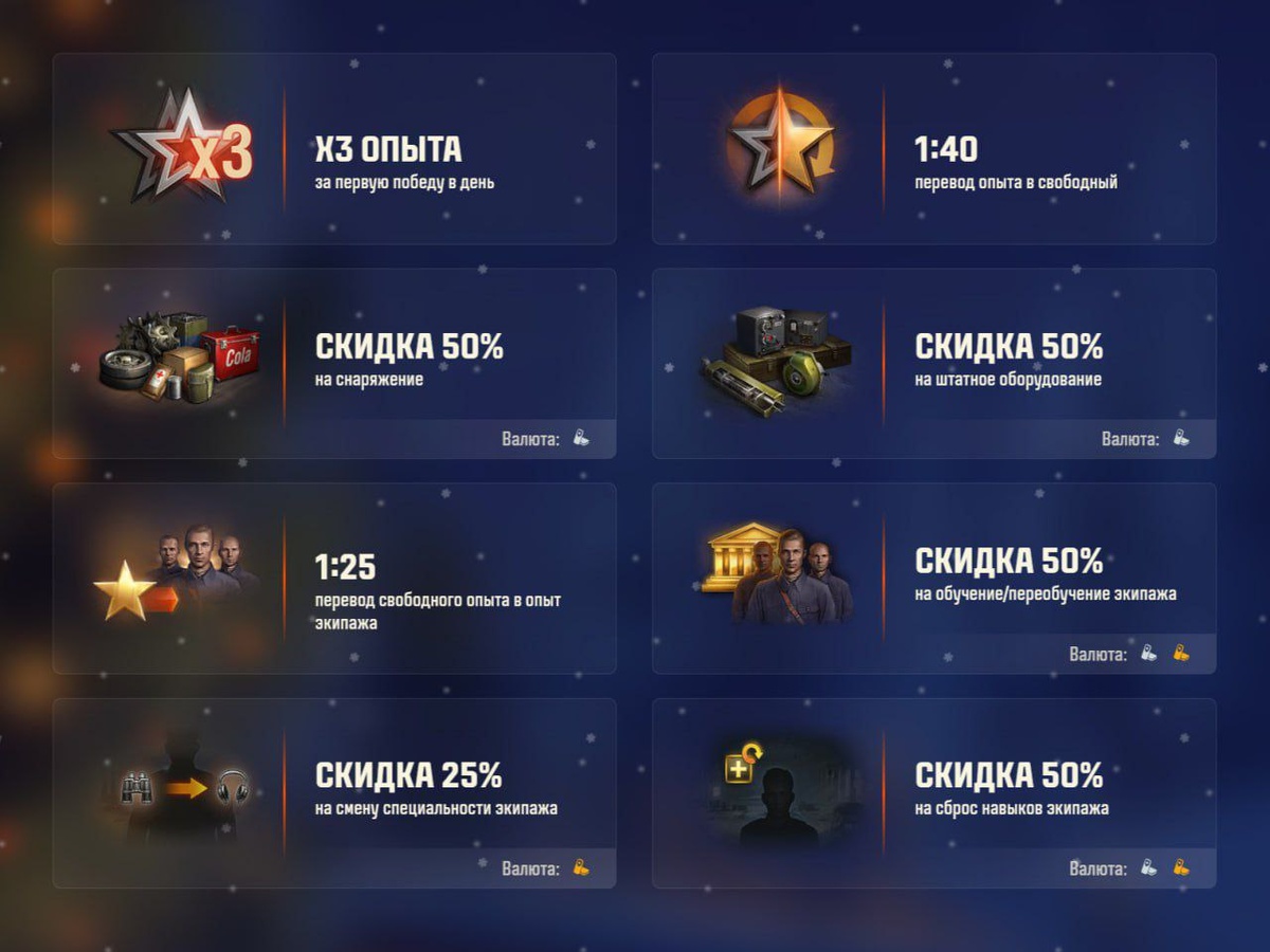 ! 💥 Получайте больше опыта за первые победы, улучшайте членов экипажа, переводите опыт по приятным курсам и выгодно закупайтесь снаряжением и оборудованием! ⏱ Время действия: 29 декабря 9:00 (МСК) — 12 января 9:00 (МСК). 🎅 С наступающим Новым годом!