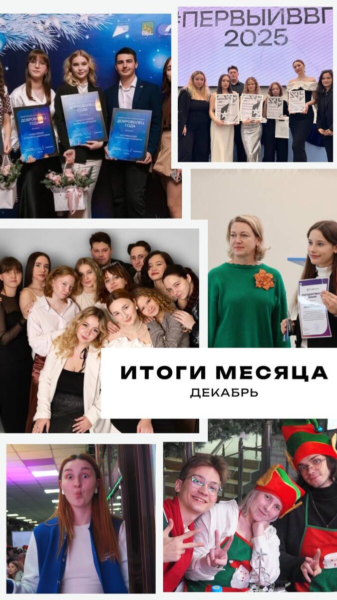 !🎄 Этот месяц был насыщен атмосферой праздника, уюта и веселья. И пришла пора подвести его итоги! 🤩Немного статистики: Проведено 17 мероприятий Выставлено 930 часов Задействовано 158 волонтёров ❄️ Провели День добровольца ❄️ Побывали на форуме #МЫВМЕСТЕ ❄️ Посетили госпиталь ветеранов ❄️ Приняли участие в пресс-конференции ТАСС ❄️ Стали победителями премии «Доброволец года» ❄️ Стали частью новогодней сказки ❄️ Провели новогодний «ЦВ+АК=КВИЗ» ❄️ Выиграли в двух номинациях премии #ПЕРВЫЙВВГУ ❄️ Закрыли год хоккейным матчем Вот они #итоги за декабрь!🥳