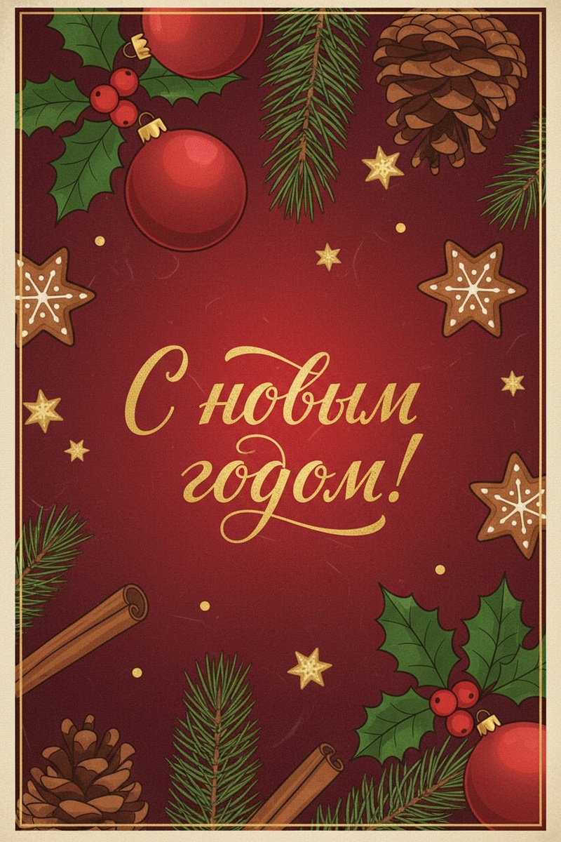 🔥 Зацени этот теплый ламповый стиль. Когда хочется не просто «глянца», а чего-то уютного, с душой и запахом мандаринов. Идеально для поздравлений, которые не выглядят как стоковая картинка. 🌚 Закидываем описание в бот и получаем открытку в стиле старой доброй книжной иллюстрации. ⚡️ Создай [винтажную ретро-иллюстрацию] новогодней открытки. В центре кадра изящная каллиграфическая надпись на русском языке: «[С новым годом!]». Вокруг текста гармонично расположены [красные матовые елочные шары, ветки сосны, листья остролиста с красными ягодами, палочки корицы и большая сосновая шишка]. Композиция дополнена [золотистыми звездами и имбирным печеньем в форме звезд]. Фоновое пространство: [глубокий темно-коричневый фон с мягким теплым свечением и текстурой зернистости]. Стиль: [классическая графическая иллюстрация, мягкие тени, приглушенные цвета, эффект старой бумаги]. Как менять: 👀 🎯 Текст (замени [С новым годом!] в промпте): - Вариант 1: «С Рождеством!» - Вариант 2: «Счастья в ново