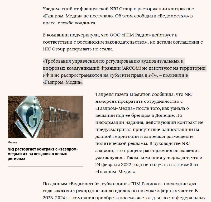 : «Требования управления по регулированию аудиовизуальных и цифровых коммуникаций Франции (ARCOM) не действуют на территории РФ и не распространяются на субъекты права в РФ», – пояснили в «Газпром-Медиа» 2-го апреля в ответ на запрос комментариев по новости Liberation от 1го апреля. Так распространяются или нет? Что теперь будут говорить сектанты ГПМ Радио, разводящие рекламодателей на деньги, обещая успешный успех? Напродавали рекламы в эфире NRJ, а оно хоп - и пропало в секунду. Деланное г-ном Лебедевым NRG - это уже какие-то не те штаны. Куда более продвинутым выглядит бренд мурманской радиостанции Power Hit Radio www.phr.ru - не удивлюсь, если многие обманутые ГПМХарями регионалы NRJ запросят франшизу PHR. Ну, хоть какое-то разнообразие в федеральном эфире случится.