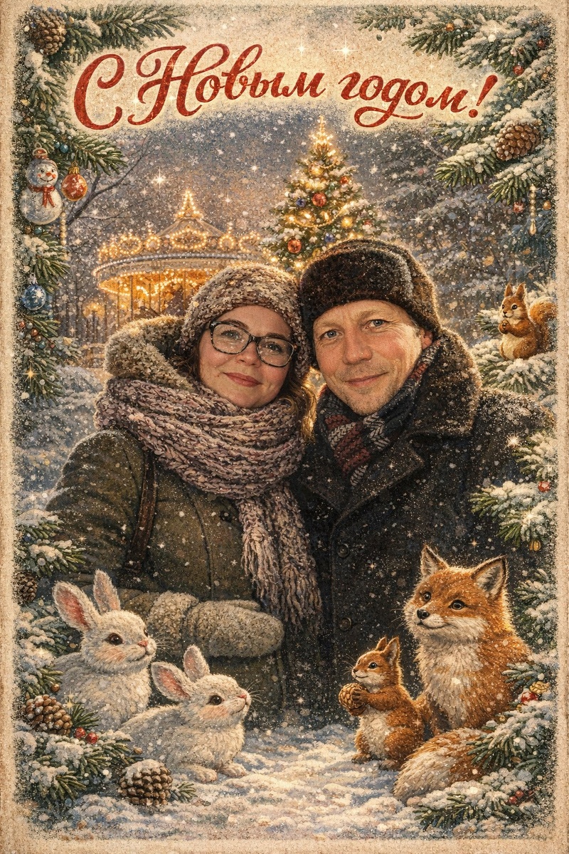 Трансформируй фотографию в иллюстрацию советской новогодней открытки, вертикальный формат. Эстетика: ностальгия 1950-70-х, сказочное настроение с мягким свечением и текстурой состаренной бумаги. Сцена: заснеженный пейзаж, наряженная ёлка с классическими стеклянными игрушками, хвойные ветви с шишками. Персонажи из фото переодеты в исторический зимний гардероб – длинное пальто, меховой головной убор, шарф, рукавицы, валенки. Окружение дополнено добродушными лесными обитателями (зайцы, белки, лиса) в мультипликационной манере. Декоративная надпись «С Новым годом!» стилизованным ретро-шрифтом. Цветовая гамма приглушённая и уютная: бежевые, красные, зелёные, кремовые оттенки. Визуальный язык – классическая советская книжная графика праздничной тематики