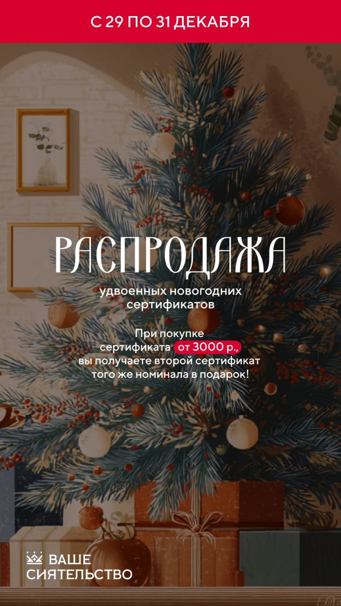 🎶🎄💥 ФИНАЛЬНЫЙ АККОРД ДЕКАБРЯ 💥🎄🎶 Только до 31 декабря — на ТРИ дня мы продлеваем феерию выгодных сертификатов. ❄️ Удвойте красоту ❄️ При покупке сертификата на любую сумму от 3 000 ₽ – вы получаете второй с таким же номиналом в подарок 🎁 Например: 💌 3000 ₽ = 6000 ₽ 💌 7000₽ = 14 000 ₽ 💌 10 000 ₽ = 20 000 ₽ 💡 Сертификат действует на все аппаратные процедуры (кроме СМАС‑лифтинга и LPG). Срок действия акции — до 31 декабря включительно. === 🌸 Оформим сертификат в уникальном стиле: добавим любое пожелание, имя, даже стихи! Получайте мгновенно: • в салоне; • в электронном виде (ВКонтакте, Telegram или на почту). Оформляйте прямо сейчас https://t.me/vashesiyatelstvo Не упустите шанс сделать роскошный подарок себе или близким! Пусть новогодняя сказка начнется с заботы о себе ❤️