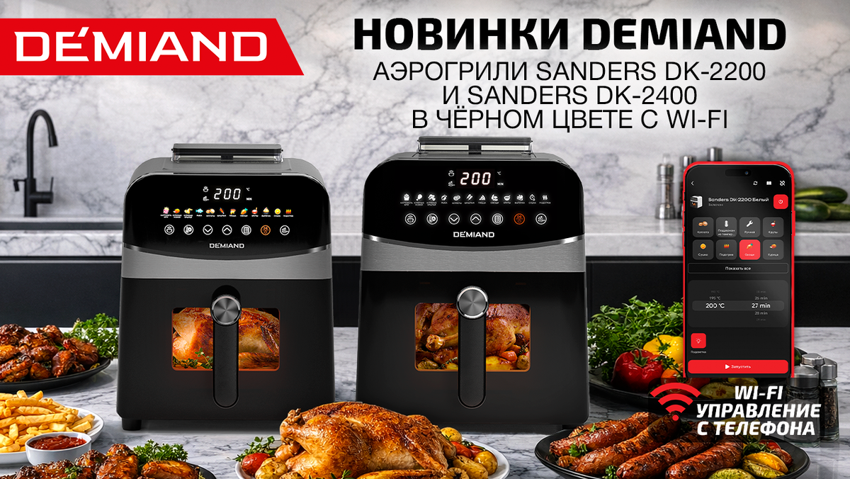 В 2026 году Demiand делает ещё один шаг к умной и удобной кухне — встречайте аэрогриль Demiand Sanders DK-2200 и аэрогриль Demiand Sanders max DK-2400 в чёрном цвете, теперь с Wi-Fi.