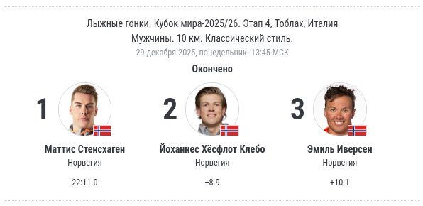 Российский лыжник Савелий Коростелев финишировал девятым в гонке на 10 км классическим стилем раздельным стартом на этапе многодневки «Тур де Ски», который проходит в итальянском Тоблахе. Обладатель Кубка России — 2024/2025 22-летний российский лыжник впервые в своей карьере финишировал в топ-10 в гонке на Кубке мира. Он проводил всего лишь четвёртую гонку на Кубке мира. За три старта до этого его лучшим результатом было 25-е место на этапе в Давосе (Швейцария) в разделке на 10 км свободным стилем. Победителем гонки стал Маттис Стенсхаген (Норвегия) — он показал результат 22 минуты 11,0 секунды. Вторую позицию занял Йоханнес Клэбо (Норвегия), уступив победителю 8,9 секунды. Третьим финишировал еще один норвежец — Эмиль Иверсен, чье отставание от лидера составило 10,1 секунды. 1. Маттис Стенсхаген (Норвегия) – 22.11,0 2. Йоханнес Клэбо (Норвегия) – 8,9 3. Эмиль Иверсен (Норвегия) – 10,1 4. Ииво Нисканен (Финляндия) – 24,3 5. Эдвин Ангер (Швеция) – 29,3 6. Эрик Валнес (Норвегия) – 30,7 7
