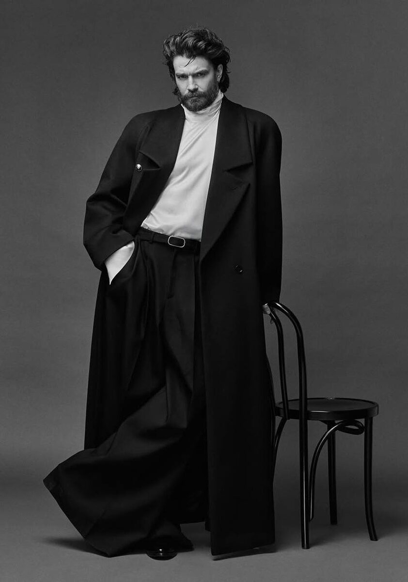 Камера Дамира Жукенова фиксирует не образ, а состояние: сдержанность, внутреннее напряжение и харизму, за которую Матвеева любят в театре и кино. В коллекции имеем свитеры и водолазки, тренчи и пальто с архитектурным кроем, кожаные куртки, пиджаки. Все вещи будто существуют между строгостью и уязвимостью, силой и сомнением. Это мужская одежда без показной брутальности, но со стержнем. Подробнее — на focusmoda.ru #ФокусМода_МужскаяМода ⚫️ focusmoda.ru