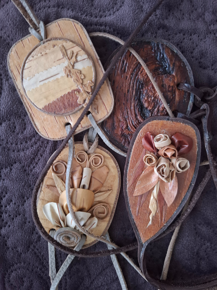 Приветствую читающих. Суета суетой , но время на рукоделие нахожу. Вязать совсем что- то перестала, надо пасхальные салфетки начинать вязать, не всех еще одарила. Берестой по прежнему занимаюсь. Почему у меня зимой возникает желание мастерить подвески, все очень просто-зима,печь, дрова. Дрова березовые , бересту на растопку от полена надо отделять. Вот тут и начинается. Удивительный материал береста. И как бумагу можно использовать и как кожу. Свойства, по моему мнению ,где то посередине между бумагой и кожей. Сколько оттенков. Когда немного знаешь свойства бересты, глядя на такое разнообразие, хочется куда- то применить. Тонкие слои, после того как подержать в горячей воде становятся пластичными. Свернуть, согнуть, зафиксировать , после высыхания сохранят заданную форму. При расслаивании цвета разные. Такие разные цвета, все дровяные остатки. Для прочности покрываю клеем ПВА, он после высыхания не заметен. Где беру идеи? Просто смотрю ручную работу броши, подвески из все