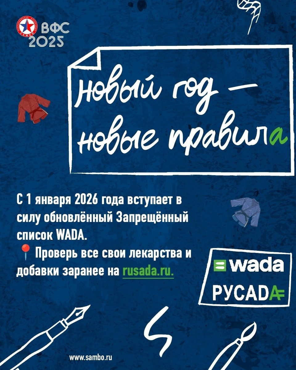 🟢 Новый год — новые правила! С 1 января 2026 года вступает в силу обновлённый Запрещённый список WADA. Проверь все свои лекарства и добавки заранее на rusada.ru.