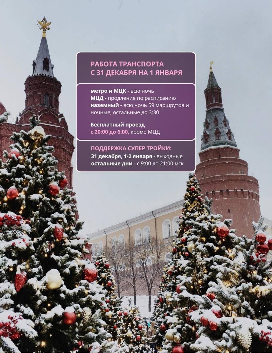 ! В новогоднюю ночь нас снова ждёт бесплатный проезд на метро, МЦК, автобусах, электробусах и трамваях. Также транспорт по традиции будет работать дольше. ☝ Поддержка Супер Тройки и Тройки Бизнес обрабатывает ваши вопросы и заявки с 9:00 до 21:00 по московскому времени, за исключением 31 декабря, 1 и 2 января. Эти дни станут выходными. С наступающим Новым годом! Подпишитесь на Супер Тройку