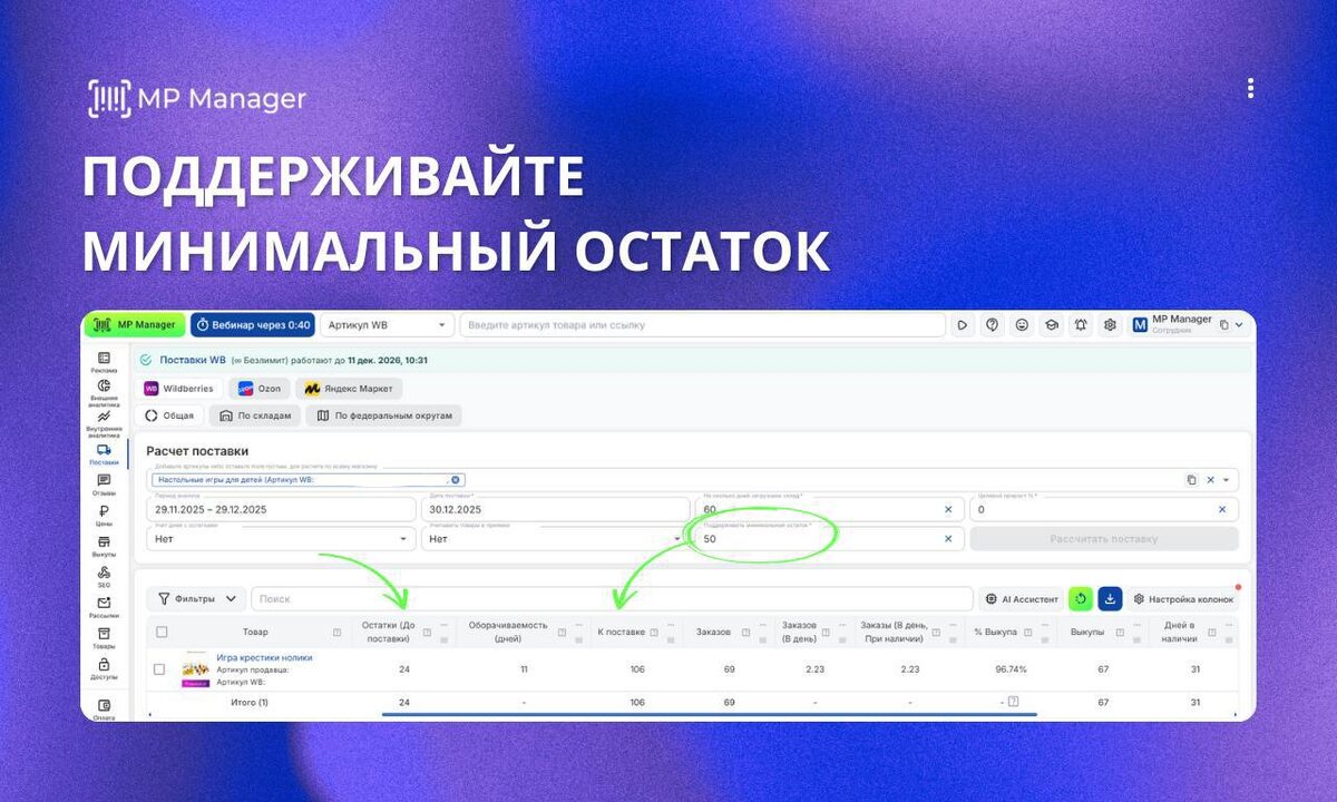 Знакомо? Вы заказали поставку, товар приехал, а через пару дней снова дефицит. Или наоборот: хотели поддерживать запас, а система считает «минимум». Мы добавили новую функцию в расчёте поставок – «Поддерживать минимальный остаток». Теперь вы задаёте целевой уровень остатка, а система сама считает, сколько нужно заказать, чтобы его поддерживать. Как это выглядит на практике: • Было: остаток 10 → рекомендация заказать +5 • Стало: цель остатка 20 → система считает 20 − 10 = +10 к поставке 🔥 Кому особенно полезно: • Брендам и производителям – для стабильного наличия весь сезон • Одежде и обуви – чтобы не терять продажи из-за отсутствия размеров • Новинкам – когда нет истории, но нужен уверенный старт 📈 Вместо «примерно хватит» - чёткое планирование запасов под ваши бизнес-цели. 📍 Навигация: Поставки → Расчёт поставки → Общая → «Поддерживать минимальный остаток» Перейти в сервис → #Поставки #РасчетПоставки