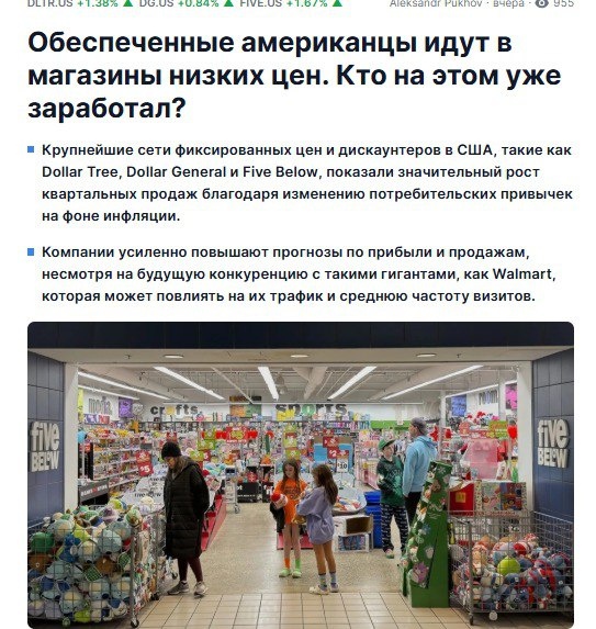 росте квартальных продаж Сеть Dollar Tree #DLTR — в числе крупнейших игроков в сегменте магазинов фиксированных цен в Штатах. И для нее 3-й квартал стал одним из самых сильных за последние годы, а сезон Хэллоуина 2025 г — рекордным. Чистые продажи компании выросли на 9,4% в годовом выражении до $4,7 млрд в 3 квартале, cопоставимые продажи — более чем на 4%, в основном за счет роста среднего чека на 4,5% при падении трафика на 0,3%. Операционная прибыль выросла на 3,8% в годовом выражении до $343 млн. Компания также повысила прогноз по скорр. прибыли на акцию (EPS) на 2025г — до $5,6 – 5,8 (предыдущий предполагал, что она составит $5,32-5,72). C начала года акции Dollar Tree #DLTR выросли на 65%. У американского дискаунтера Dollar General #DG чистые продажи в 3 квартале выросли на 4,6% в годовом выражении до $10,6 млрд, продажи в сопоставимых магазинах увеличились на 2,5% за счет роста посещаемости на 2,5%. Средний чек не изменился. Операционная прибыль выросла на 31,5% до $425,9 млн.