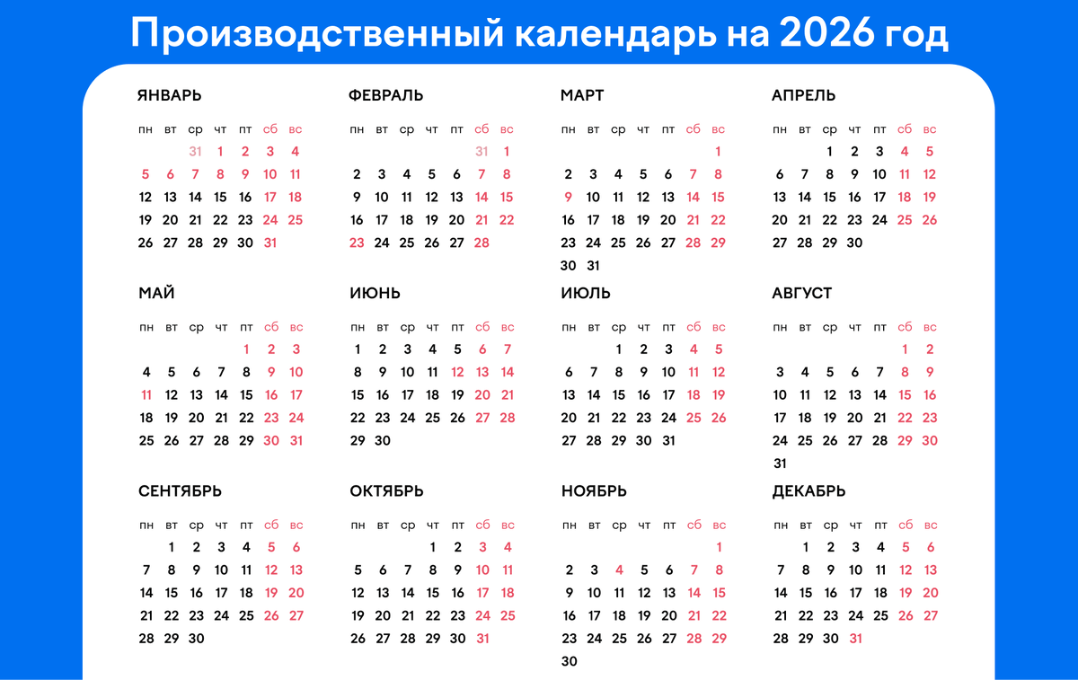 Друзья, всех приветствуем! На канале "ЖКХ: вопросы и ответы" стало уже доброй традицией публиковать и разбирать производственный календарь перед крупными праздниками и долгими выходными. Поэтому сейчас быстренько раскидаем все праздничные, выходные и рабочие дни. Сегодня как раз отличный день для этого, можно сказать, лучшая неделя в году - понедельник, за ним сразу пятница, потом новый год и дальше выходные\каникулы 😁 Неделя мечты. Вот бы 52 раза в году так. Итак, на этой неделе мы работаем 29-30 декабря, а с 31 декабря по 11 января 2026 года включительно отдыхаем. Дополнительно каждый год правительство определяет, какие праздничные дни нужно перенести, если они выпадают на официальные выходные. В 2025 году Правительство приняло Постановление от 24.09.2025 № 1466 "О переносе выходных дней в 2026 году". По этому постановлению переносятся следующие выходные дни: Все выходные и праздники отмечены на календаре Минтруда красным цветом Не много переносов. В уходящем году, например, был ц