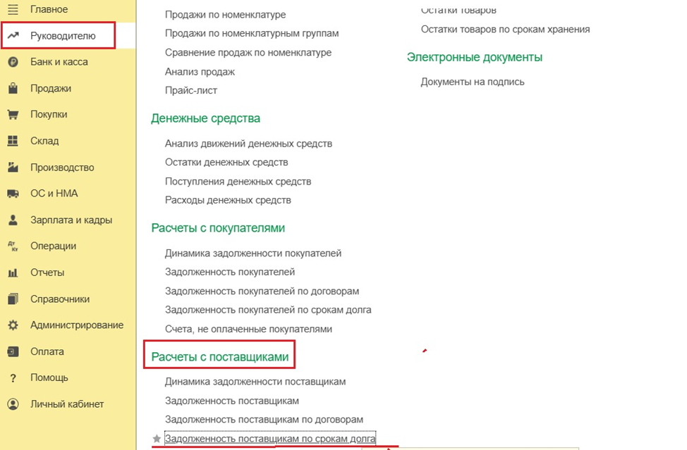 Данный отчет необходим, чтобы посмотреть просроченные долги. Либо ознакомиться с информацией, когда нужно произвести оплату. Можно сгруппировать долги по периодам. Для этого в программе зайдем в раздел Руководителю. Расчеты с поставщиками. Нам необходим отчет: Задолженность поставщикам по срокам долга Выбираем дату, на которую необходим отчет. Предприятие. Сформировать. Отчет группирует задолженность по периодам, которые настроены по умолчанию. Так же есть возможность установить свои периоды.