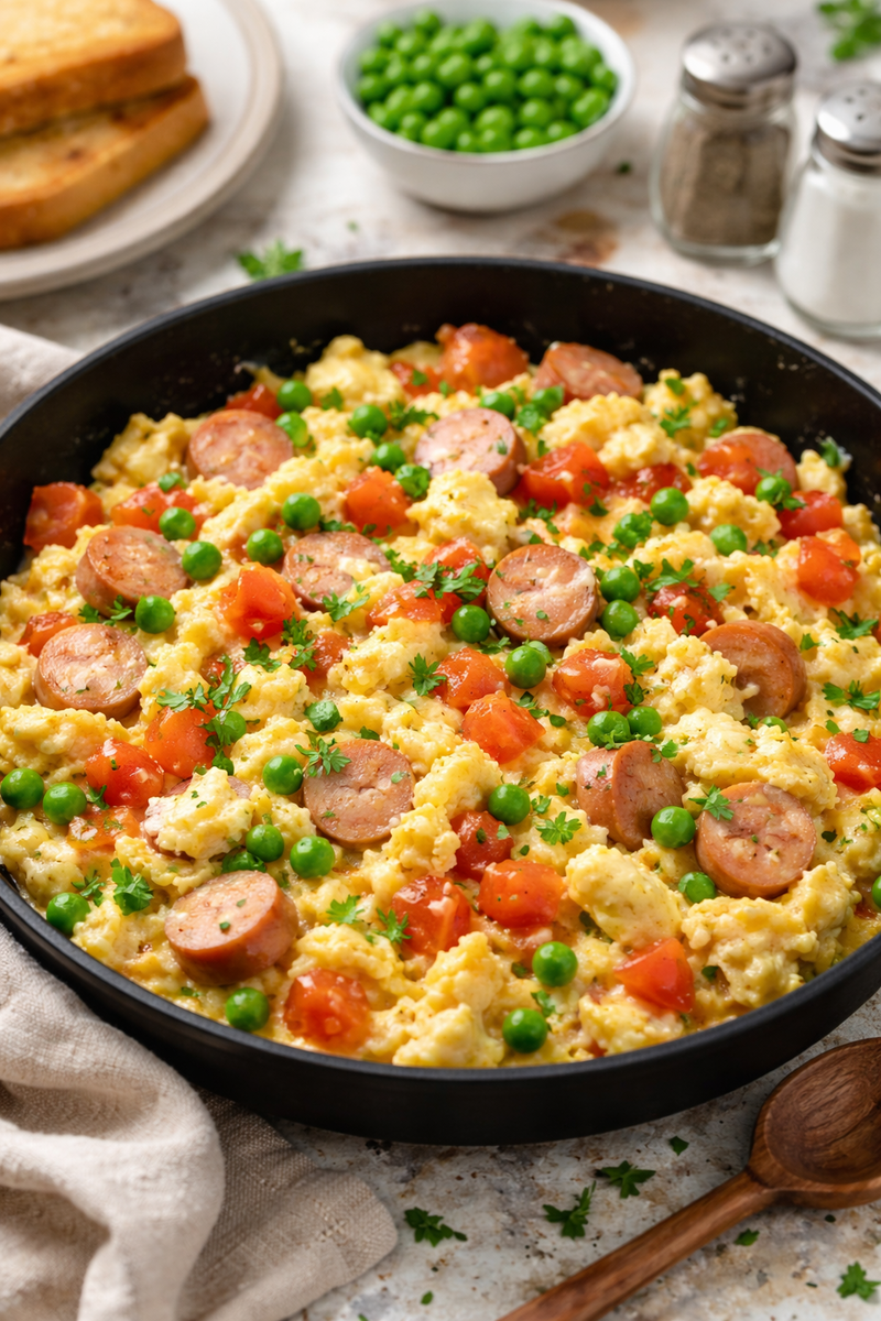 Скрембл — это одно из самых простых и быстрых блюд из яиц, но именно в нём чаще всего допускают ошибки. Я сама долго готовила «что-то среднее между яичницей и омлетом», пока не разобралась в нюансах. Сегодня делюсь проверенным рецептом скрембла с помидорами, сосисками и зелёным горошком и раскрываю все секреты, чтобы он получился нежным, сочным и вкусным даже у новичка.