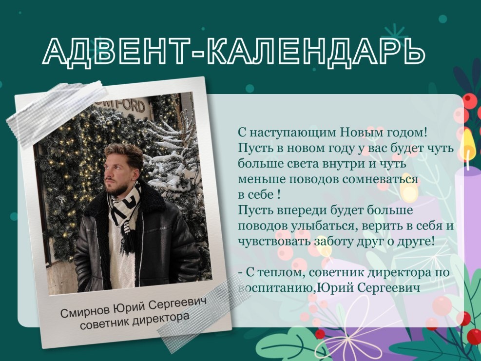 🎄 Эту неделю начинаем с поздравления от советника директора по воспитанию Смирнова Юрия Сергеевича. А увидеть весь календарь можно по ссылке: https://vk.com/album-206909974_307859010 #ДОНМ #ШколыКолледжиМосквы