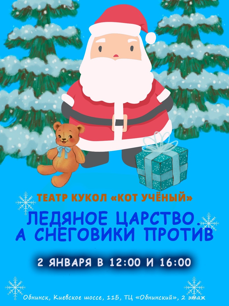 А Снеговики против»: ❄2 января в 12:00 и 16:00 🎅Новогодняя сказка зимнего города. Как известно, в Новый Год исполняются желания. А Дед Мороз следит, чтобы исполнялись только добрые желания. А как же быть тем, у кого желания злые? Не пустить в город Деда Мороза! 💦И вот злые сосульки захотели всех-всех заледенить, переселиться в людей, чтобы уже никогда не растаять. А до заветного момента, когда загадываются желания, остаётся совсем чуть-чуть. 😱Неужели злые сосульки победят, и все станет ледяным и все станут ледяными? Неужели Дед Мороз ничего не сможет сделать? Неужели у него не найдутся помощники? Чтобы всё об этом узнать, приходите к нам на спектакль. 🎫Билеты можно приобрести на месте непосредственно перед спектаклем либо онлайн по ссылке - teatr-kukol-kot-uchyonyj.qtickets.ru/ 💰350₽ вне зависимости от возраста и на каждого зрителя. 🎟 +7 (910) 706-95-05/+7 (910) 914-21-76. 🚩Обнинск, Киевское шоссе, 11Б, ТЦ «Обнинский», 2 этаж 👍 Подписаться | Ваша реклама