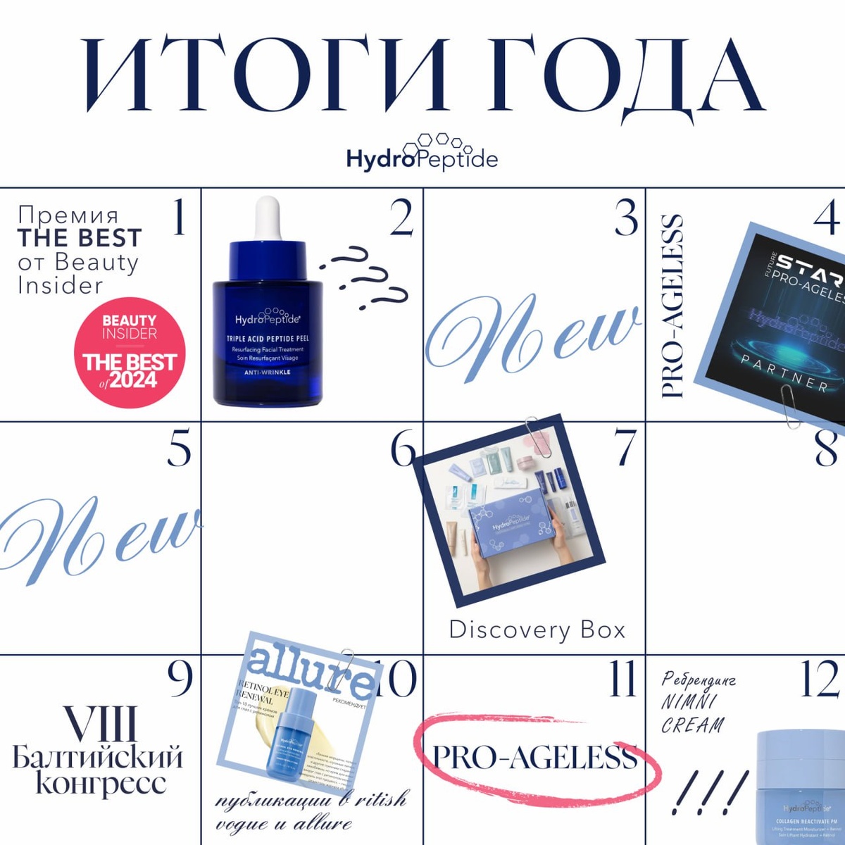 ❄️ Давайте вспомним уходящий год и те прекрасные моменты, которые мы разделили вместе с вами: 🎄Январь 6 продуктов HydroPeptide получили премию "The BEST" от Beauty Insider ❄️Февраль Ребрендинг Triple Acid Peptide Peel — именно тогда мы увидели этот продукт в новом образе. ⛅️Март NEW — гидрогелевая маска для губ PolyPeptide Collagel + Lip стала вашим помощником в уходе за губами. ☀️Апрель HydroPeptide — партнер X международного конгресса эстетической медицины PRO-AGELESS 🌸Май NEW — солнцезащитный стик Sun Slick появился на ваших полках в этот месяц. 🌿Июль Именно тогда мы выпустили первую версию Discovery Box, которая влюбила в себя многих! 🍁Сентябрь HydroPeptide стал участником двух конгрессов и выступил с научным докладом: 🔤VIII Балтийский конгресс по пластической хирургии и косметологии 🔤Конгресс по нежелательным явлениям в эстетической косметологии Adverse Event Congress 2025 🍂Октябрь В этот месяц наш бренд упоминался в мировых журналах чаще всего. ☁️Ноябрь Еще один