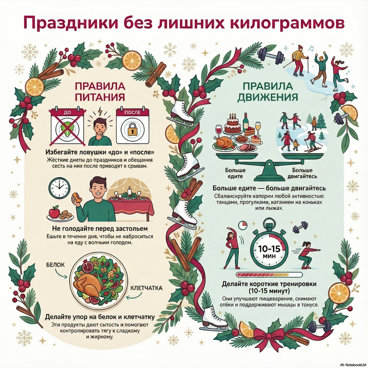 Приближение новогодних праздников или долгожданного отпуска — это время радости и отдыха. Но для многих оно омрачается тревогой: как насладиться застольями и не набрать лишние килограммы? Страх перед весами после каникул заставляет либо заранее садиться на жёсткие диеты, либо мысленно готовиться к «наказанию» в виде ограничений после.