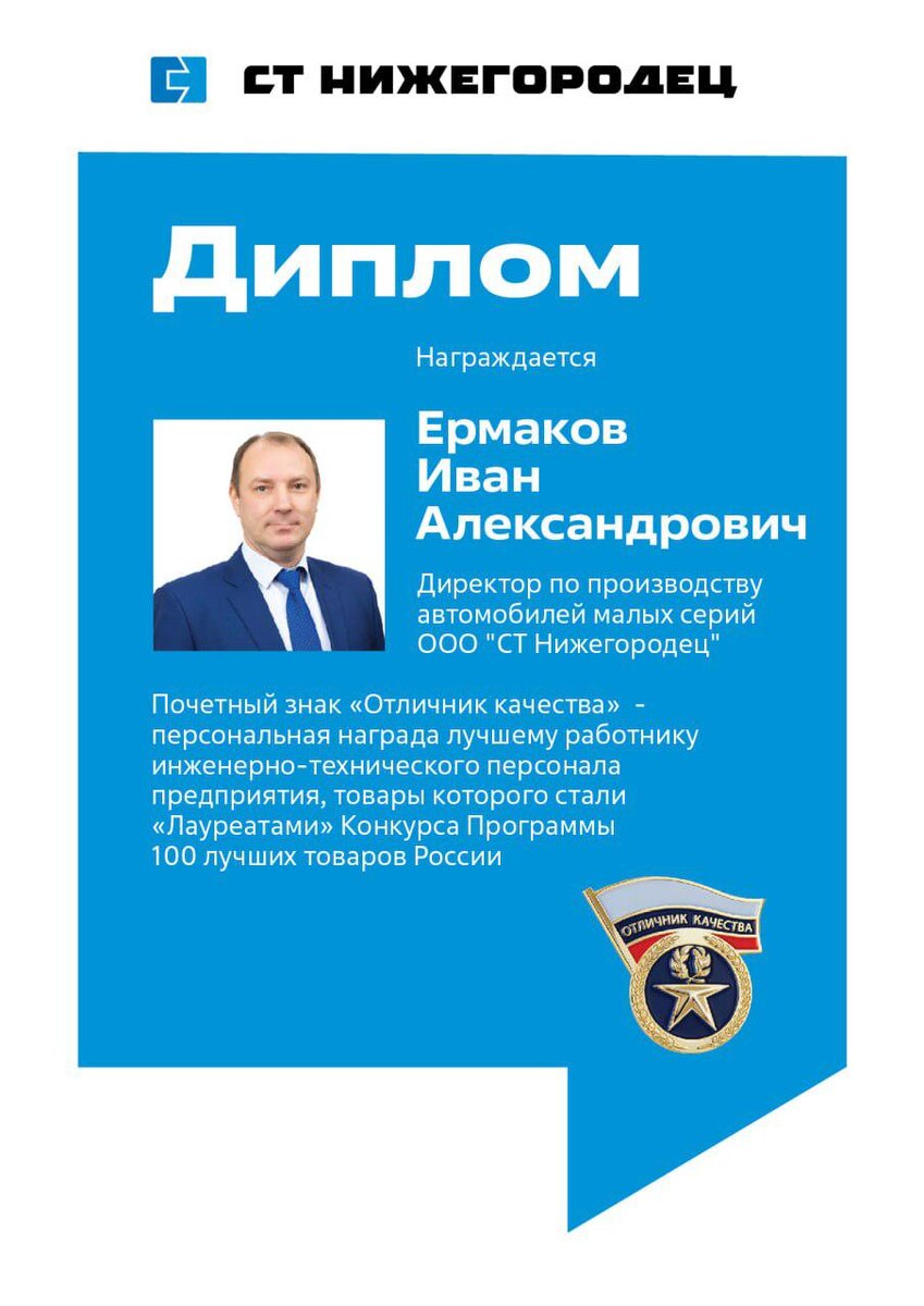 Почётным знаком «Отличник качества» награждён Ермаков Иван Александрович — директор по производству автомобилей малых серий. Это персональная награда, присуждаемая лучшим работникам предприятий — участников программы.