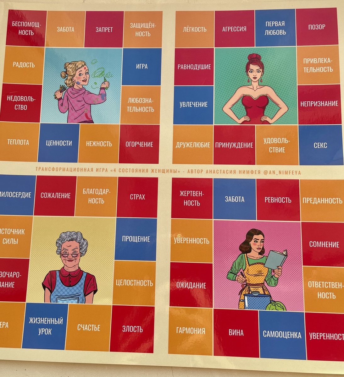 ” Психологическая трансформационная игра, в основе которой лежит прохождение самых важных состояний женщины: девочки, девушки, женщины и бабушки или старухи. 🧊Это четыре грани совершенства. 👱🏼♀️Четыре важных состояния, которые волею или неволею проживает каждая женщина. ➖➖➖➖Это 4 столпа, на которых держится вся женская сила. В процессе игры участница проживает и проходит 4 грани одного или нескольких состояний, прорабатывает травмы, находит ресурсные подсказки и получает подарки в виде озарений, новых осознаний, инсайтов, практических рекомендаций к действию. Игра помогает проработать базовые состояния: ❤️ любви, 🤗 доверия, ✔️принятия, ✊🏻 безопасности, 🙌🏻 ценности, ☺️ уважения по отношению к себе и миру в целом, ⛓️💥освободиться от закоренелых негативных эмоций, обид, страхов, сожалений, тревог, зависимостей, чувств вины и других тянущих нас вниз вещей. 🗺 Это своего рода путешествие по всей нашей женской жизни. По прошлому, настоящему и будущему. Подробнее о трансфораци