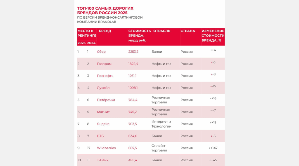 ПИК занял 50 место с оценкой в 75 млрд рублей, а «Самолет» — 63 место с оценкой в 46,2 млрд. Годом ранее ПИК оценили в 77 млрд рублей (49 место), а «Самолет» — 26,7 млрд рублей и на 70 место. Совокупная стоимость всех 100 брендов, входящих в рейтинг, выросла по отношению к 2024-му на 4,4% и составила 18,8 трлн рублей. Это около 9,4% от ВВП страны.