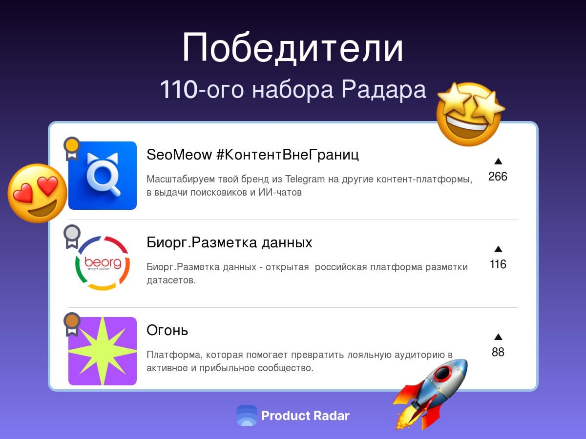 110-й набор 🥇SeoMeow Масштабируем твой бренд из Telegram на другие контент-платформы, в выдачи поисковиков и ИИ-чатов 🥈Биорг.Разметка данных Биорг.Разметка данных – открытая российская платформа разметки датасетов. 🥉Огонь Платформа, которая помогает превратить лояльную аудиторию в активное и прибыльное сообщество. Новый раунд стартапьих бегов и новые проекты уже на вашем Радаре!🌚 — ⭐️ Вы можете Поддержать Радар и получить значок «Друг Радара», а также доступ в закрытый канал и к базе знаний для развития стартапа с нуля — 📤СТАВЬТЕ РЕАКЦИИ: «🎉» – Урааааа! «🔥» - Все молодцы! «🏆» - Я голосовал(-а) за победителей