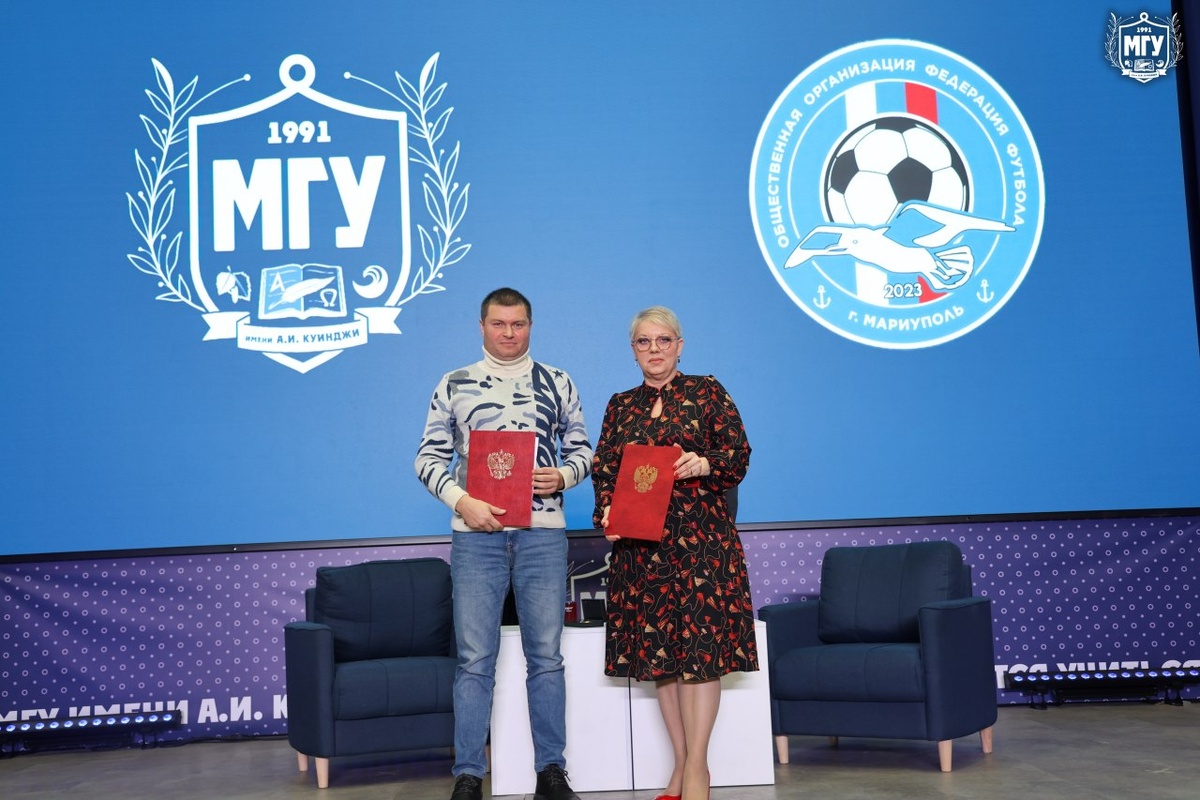 🤩 В МГУ имени А.И. Куинджи состоялась торжественная церемония подведения итогов работы студенческого спортивного клуба «МанГУст» за 2025 год. 🤩 С приветственным словом выступила ректор МГУ имени А.И. Куинджи Лариса Анатольевна Сиволап: «2025-й стал годом ярких побед, смелых начинаний и настоящего спортивного роста. Мы собрались, чтобы вспомнить достигнутое и почувствовать силу нашего единства, в котором сплетаются воля спортсмена, мудрость наставника и поддержка наших надежных партнеров». ✅ В рамках церемонии были подписаны соглашения о сотрудничестве с федерацией футбола города Мариуполя в лице президента Ивана Константиновича Иващенко, федерацией гонок дронов (беспилотных воздушных судов) России в ДНР в лице председателя Сергея Игоревича Бондаренко, федерацией спортивной борьбы Приазовья ДНР в лице президента Алексея Михайловича Чекаленко, федерацией бокса города Мариуполь в лице директора Евгения Константиновича Савченко, Футбольным клубом «Мариуполь» в лице спортивного директор