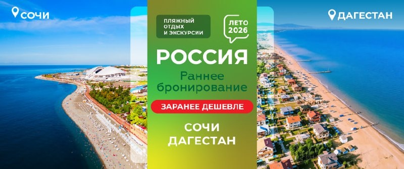 Лето 2026. Раннее бронирование Рады сообщить, что доступны к бронированию пляжные и экскурсионные туры по России на сезон Лето 2026! 1. Сочи ✔️ Туры на гарантированных блоках мест 27 Городов вылета: Иваново, Киров, Барнаул, Екатеринбург, Казань, Кемерово, Красноярск, Курган, Магнитогорск, Нижневартовск, Нижнекамск, Нижний Новгород, Новокузнецк, Омск, Оренбург, Орск, Пермь, Самара, Санкт-Петербург, Сургут, Сыктывкар, Томск, Тюмень, Ульяновск, Уфа, Чебоксары, Челябинск. 2. Дагестан ✔️Туры на гарантированных блоках мест 12 Городов вылета: Иваново, Киров, Екатеринбург, Ижевск, Казань, Нижнекамск, Самара, Санкт-Петербург, Саратов, Тюмень, Уфа, Челябинск. ✔️Туры на основе GDS 9 Городов вылета: Москва, Минеральные Воды, Минск, Норильск, Сочи, Сургут, Новосибирск, Нижний Новгород, Пермь. ✔️Экскурсионные туры: • Дагестан: Большое путешествие по Дагестану • Дагестан: Гостеприимный Дагестан 3н/4д • Дагестан: Гостеприимный Дагестан 4н/5д • Дагестан: Дагестанский экспромт • Дагестан: Две