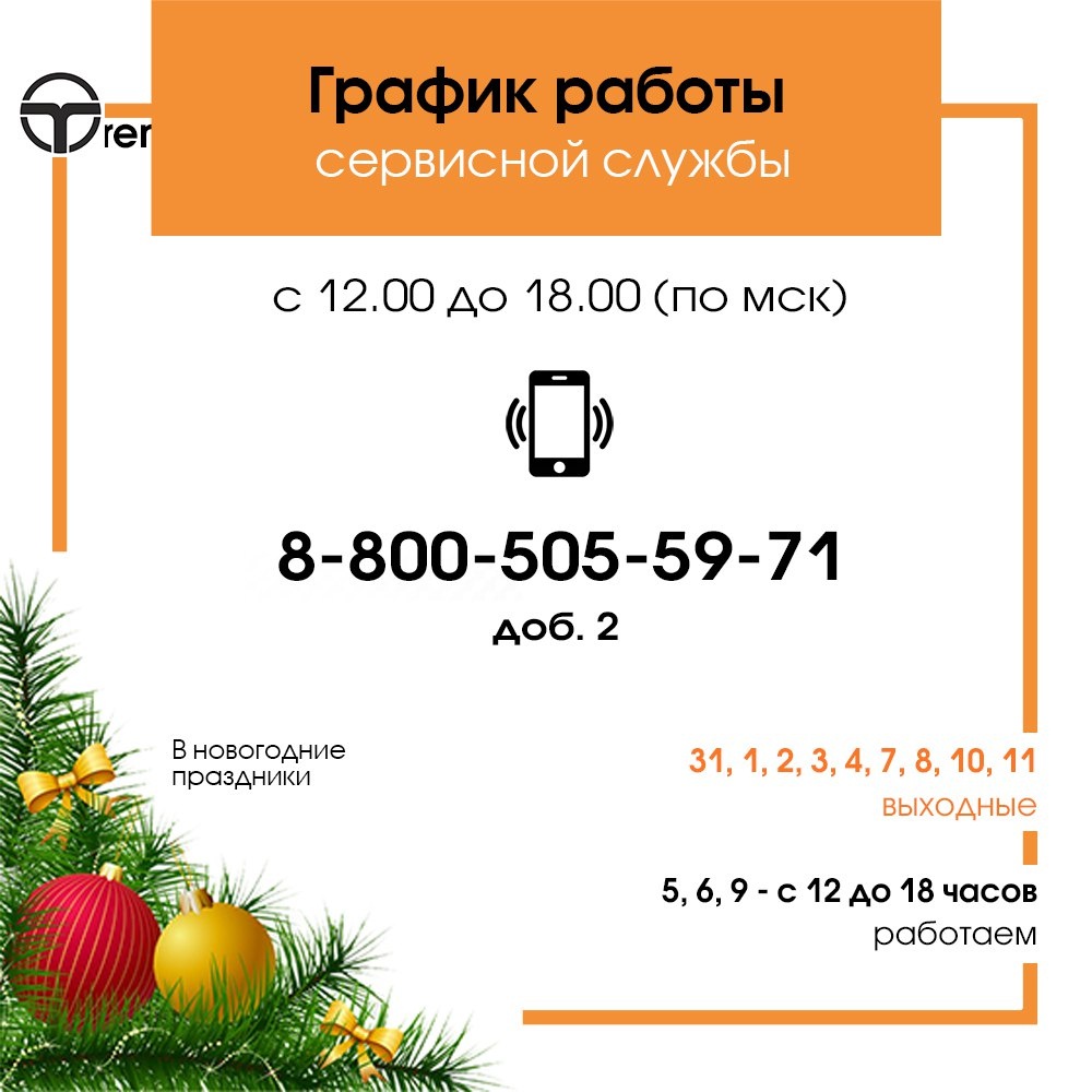 : 🎄с 31.12 по 11.01 - выходные дни 🔸с 12.01 - работаем График работы Сервисной службы: 🎄31.12 - 04.01 - выходные 🔸05.01 - 06.01 - работаем 🎄07.01 - 08.01 - выходные 🔸9 - работаем 🎄10.01 - 11.01 - выходные ‼️В дни работы сервисной службы заявки обрабатываются с 12 до 18ч (по мск). Телефон сервисной службы: 8-800-505-59-71, доб.2. ☝️Заявки на сервисное обслуживание, оставленные в выходные, будут обработаны в дни работы сервисной службы в порядке очереди.