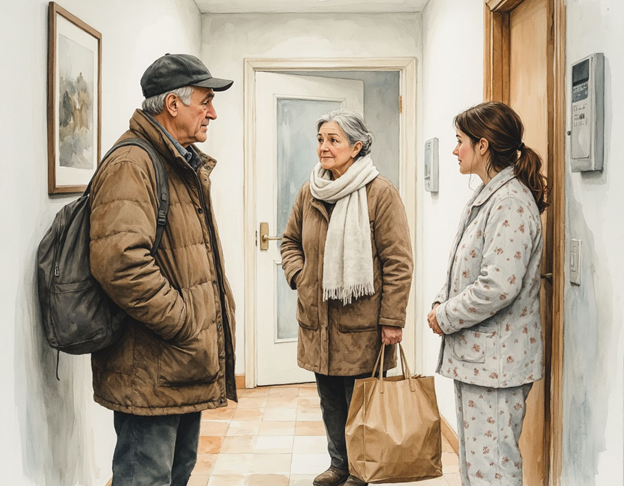 На пороге стояли родители. Отец, в своём тёмном, чуть тесноватом на животе пуховике, с огромной сумкой в одной руке и банкой солёных огурцов в другой. Мать — в старом пальто, из-под которого выглядывал подол домашнего платья. Лица у обоих были заиндевевшими от мороза и напряжёнными.