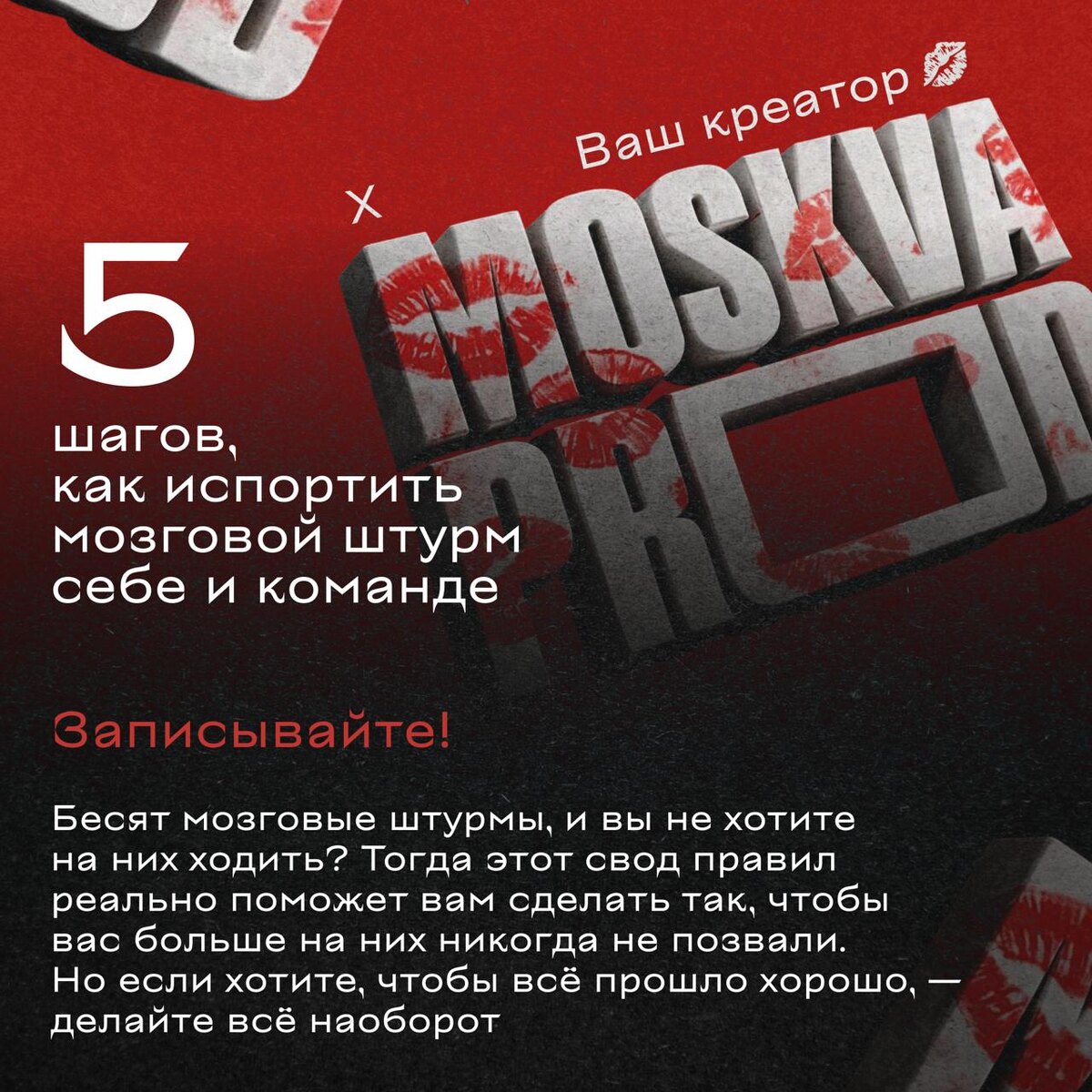 Если идеи не идут, команда бесит, а само слово «брейншторм» вызывает лёгкую аллергию — поздравляем. Редакция «Очень креативного медиа» совместно с каналом «Ваш креатор» собрали идеальный чек-лист, как гарантированно развалить любой креативный процесс и испортить его всем участникам. Здесь есть всё: игнорирование брифа, борьба за главное кресло, ранний хейт идей и фирменное «серьёзное лицо», при котором не рождается ничего живого. Листайте карточки и запоминайте. А если вдруг хотите, чтобы штурмы всё-таки работали — просто делайте наоборот.
