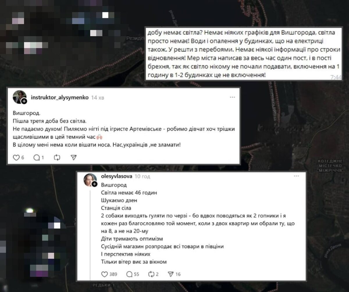 В городе уже третьи сутки зафиксированы масштабные перебои с электроснабжением. Из-за критической ситуации со светом, также отсутствует вода и тепло в домах. «Нет никаких графиков для Вышгорода, света просто нет! Воды и отопления в домах, которые на электричестве, тоже. У остальных — с перебоями. Нет никакой информации о сроках восстановления! Мэр города за всё время написал один пост, и в посте ложь, так как свет никому не начали подавать, включение на 1 час в 1-2 домах — это не включение!», - жалуются жители. Тем временем, нардеп Сергей Нагорняк заявил, что не только в Вышгороде, но и в Броварах Киевской области света может не быть до недели. По его словам, удар пришёлся по подстанции, которая распределяет электроэнергию Киевской ГЭС. «Для восстановления всей инфраструктуры, пострадавшей во время последней массированной атаки, потребуется не неделя, а несколько недель, возможно даже месяцы», - заявил он. Всего в Киевской области без света остаются 9 тысяч потребителей, сообщает У