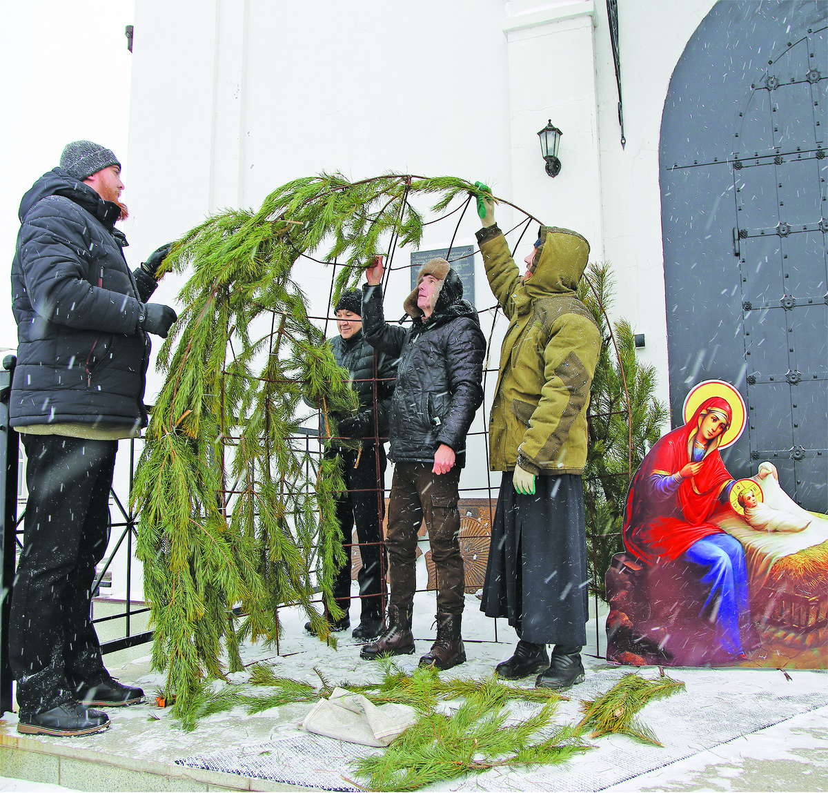 В преддверии Рождества Христова духовенство и прихожане украшают соборы, храмы, монастыри и церковные территории Завершается рождественский пост и в православных приходах стартует марафон благолепия. Каждая община во главе с настоятелем старается преобразить интерьер и экстерьер храма. Вот и в Михайло-Архангельской церкви начались радостные хлопоты. Внутри зданий устанавливают душистые ели, сосны, которые увешивают гирляндами, игрушками, на центральном аналое размещают украшенную икону Рождества Христова. А во дворе появляется еще один непременный атрибут радостного семейного праздника—вертеп. Вот что рассказал настоятель Михайло-Архангельского храма, иерей Евгений Ефимов: --Праздник Рождества Христова отмечается в воспоминание о рождении Господа Иисуса Христа, которое произошло в пещере рядом с Вифлеемом. И уже много столетий, встречая это событие, принято готовить подобные пещеры, чтобы напомнить верующим, где родился Сын Божий, устанавливать в них фигурки главных действующих лиц. Эт