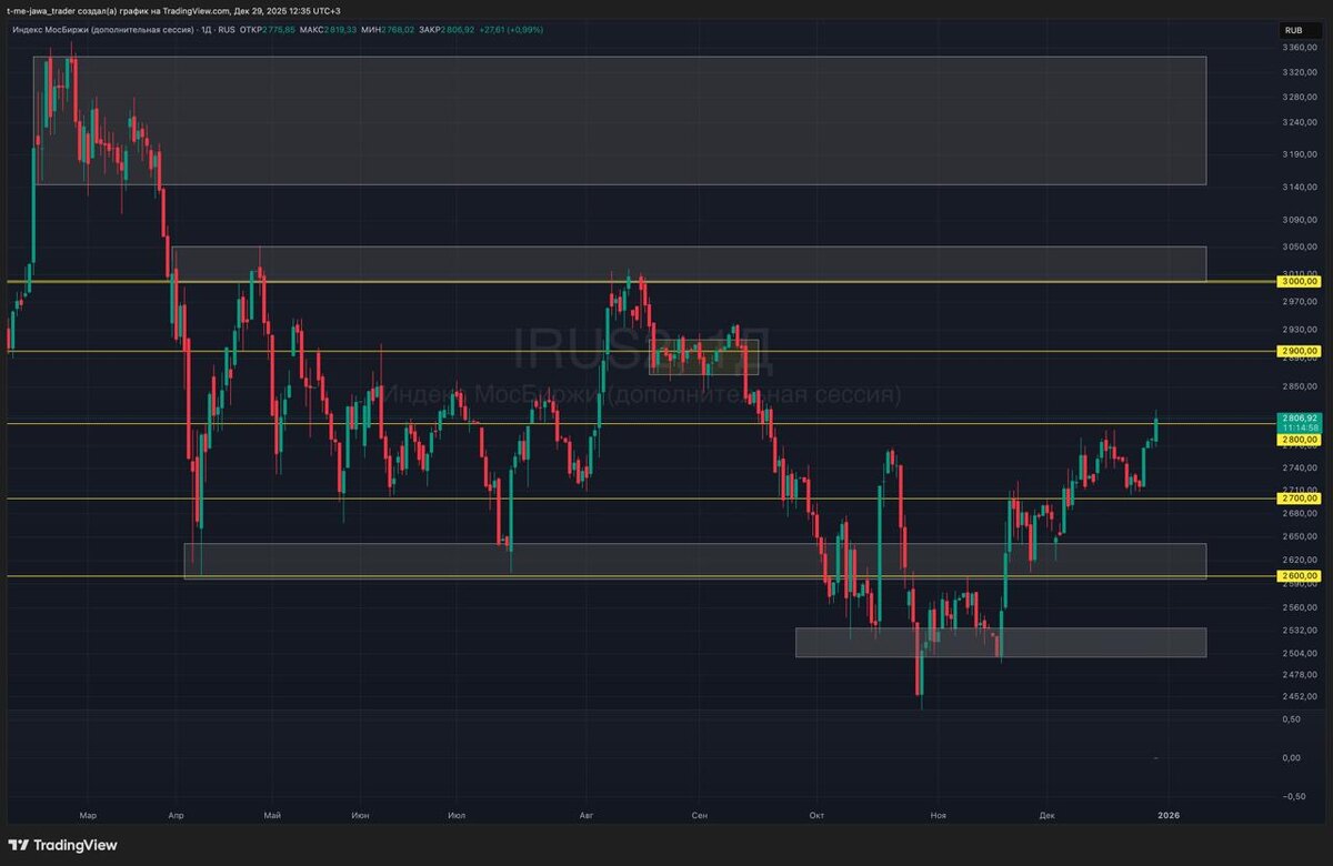 ! Переговоры в выходные прошли и похоже что до многих начинает доходить, что мир может быть близко. Индекс Мосбиржи 🇷🇺 $IMOEXF, $MXH6, $MMH6 сегодня хорошо растет, в моменте пробиваем 2800. Посмотрим, получится ли уже сегодня закрепиться выше. Итоги переговоров в целом ожидаемые, пойдет утресание договоренностей. Понятно, что публично много не будут говорить. Я считаю, что позитивные сюрпризы могут запросто быть уже в январе или даже в праздники. Точно не стоит уходить в шортах на праздники и в целом, шортить не стоит. Но и лонговать на все плечи тоже не надо, на эмоциях может вынести куда угодно. Всем хорошей недели и профита! 👉 Подпишись на Jawa Trader