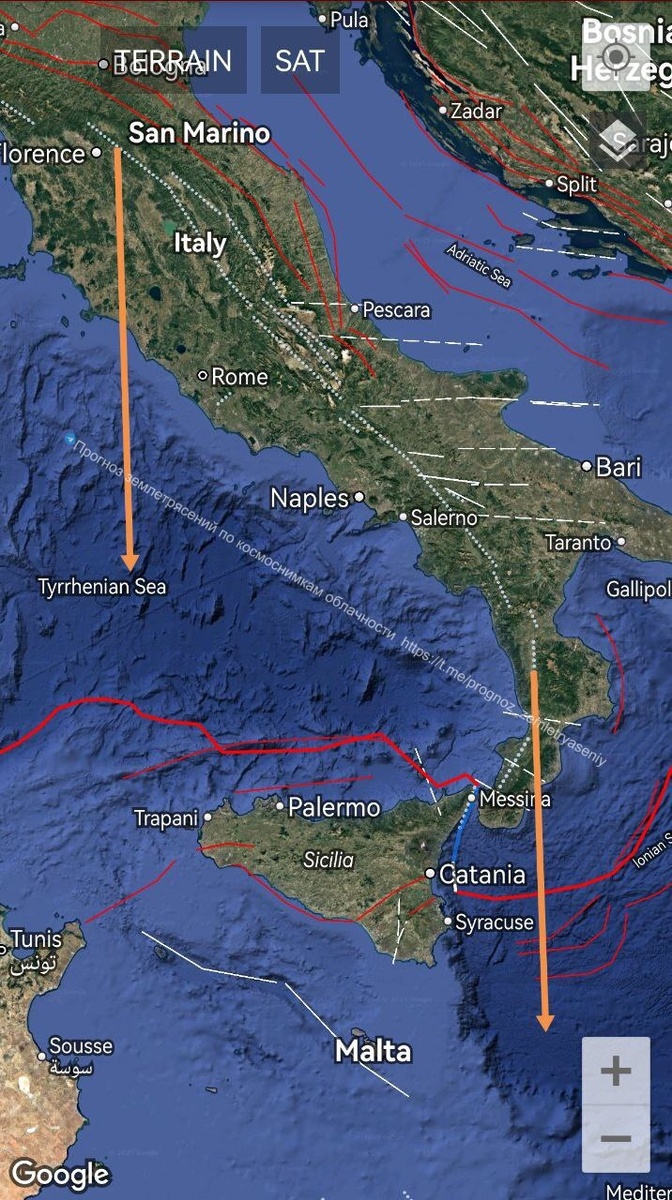 Это может спровоцировать усиление активности Этны, либо еще и потрясёт. ===== A CSTI formed over Sicily, tracing the rift zone on the Apennine Peninsula. This can trigger an increase in Etna's activity, or even an earthquake if Etna fails to cope with the release of tectonic stress.