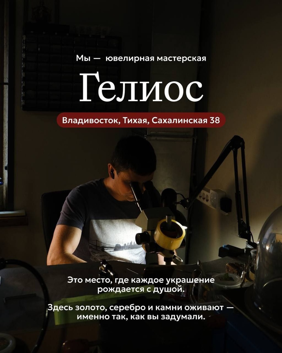 Уже более 15 лет создаём и возвращаем к жизни ваши украшения. Мы делаем украшения любой сложности и чиним их с вниманием к каждой детали. Всё — вручную, с любовью и уважением к вашему времени. Так же, у нас Вы можете приобрести как новые изделия созданные нашим мастером, так и изделия от поставщиков и б/у украшения по очень приятным ценам! В нашем профиле вы увидите: — как рождаются украшения, — реальные заказы клиентов, — советы по уходу за ювелиркой, — и немного волшебства А если нужно что-то починить — приходите, сделаем всё как надо и даже лучше. Единственная ювелирная мастерская в районе Бухты Тихая! Дарим скидку 10% на изготовление украшения при подписке на наши социальные сети: ▫️телеграмм-канал https://t.me/gelios_jewelry_vl ▫️инстаграм @gelios_jewelry.vl 📍 Владивосток, ул. Сахалинская 38