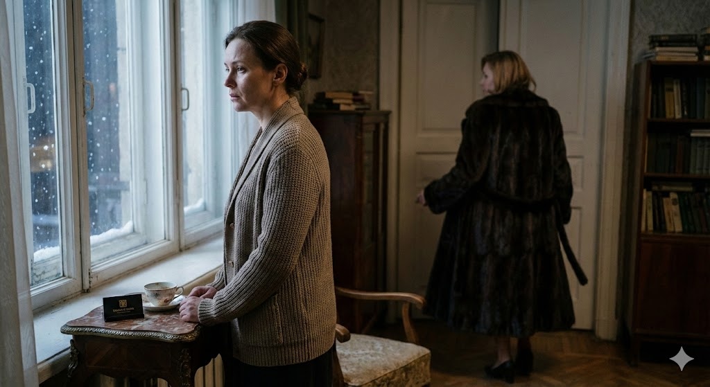 Лена осталась стоять посреди гостиной. Запах сладких духов душил её. Она посмотрела на визитку, черным пятном лежащую на белой обложке книги. Взгляд метнулся к телефону — немому, бесполезному куску пластика.