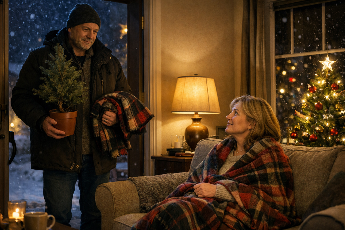 — Я купил ёлку, — сказал он тихо. — Маленькую. Думал, тебе понравится. И плед взял. Твой любимый.