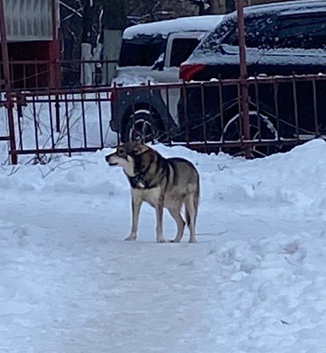 Найдена (замечена) собака. Возле 38 школы район доброе , собака лает , не уходит , какая то проблема с задними лапами видимо очень замерз,близко не могу подойти со мной двухмесячный маленькая ребенок , еду положили