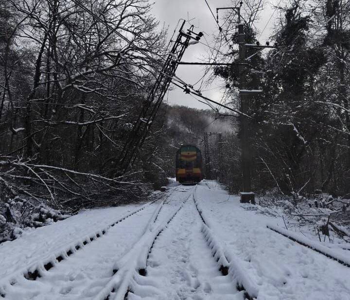 Состав остановился на станции «Гагра» в связи со снегопадом и падением деревьев на контактную сеть.
