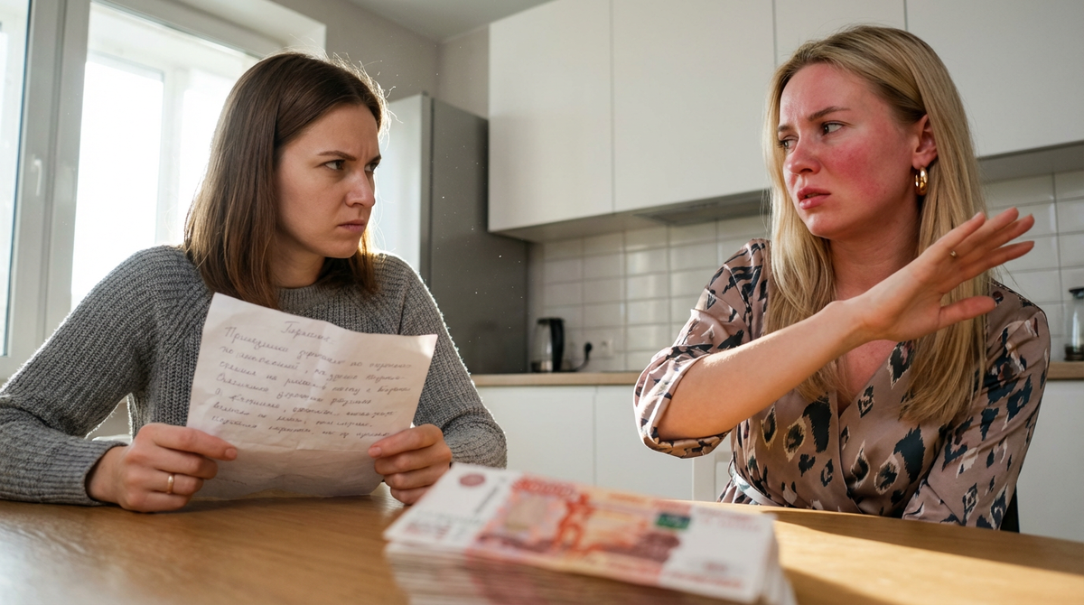 Встреча происходила в коридоре квартиры Елены и Сергея. Оксана выглядела помятой и злой. Она молча швырнула пачку пятитысячных купюр на тумбочку.