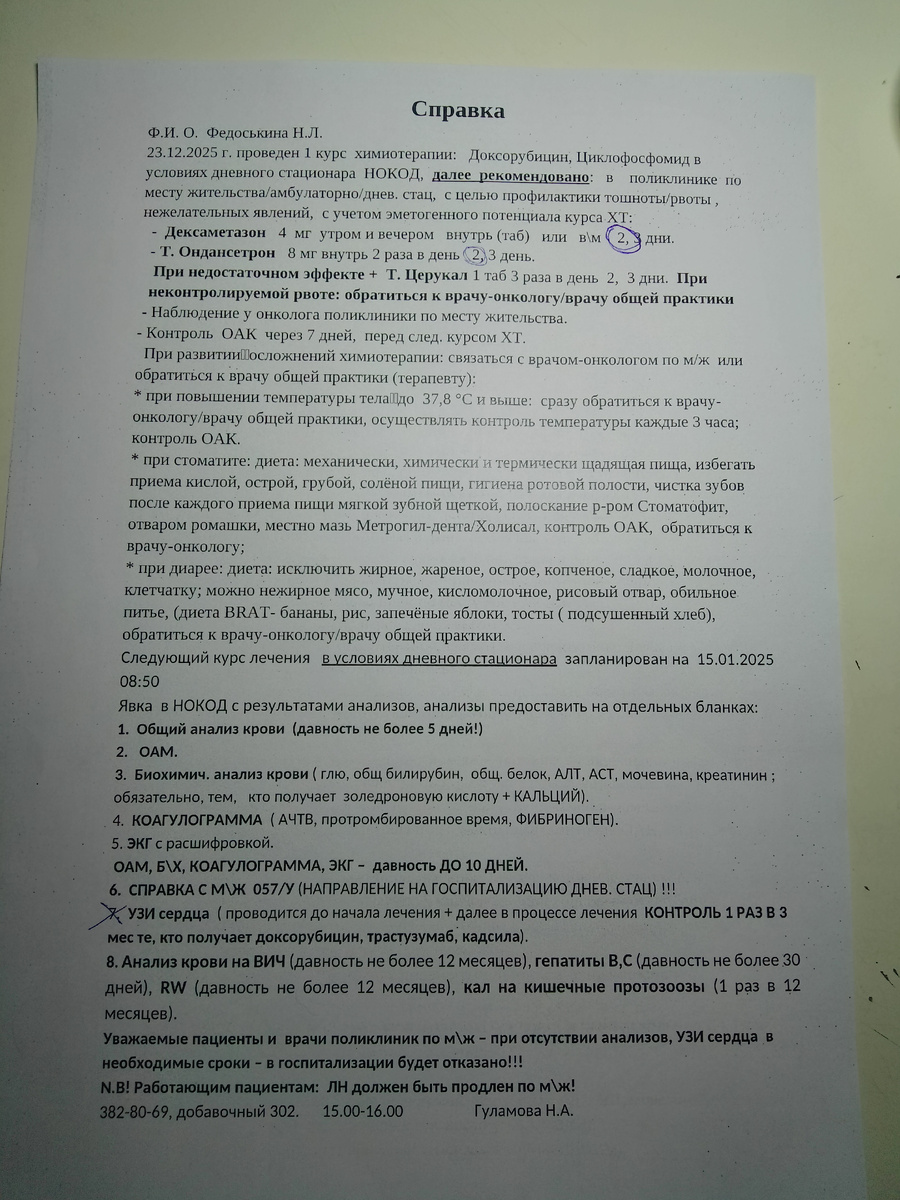 Далее начала я ходить на уколы. Это масляные уколы, с желтоватой жидкостью, которые выдают погреть в руках, пока сидишь в коридоре перед процедурной. Первый раз я провела перед уколом в коридоре 5 (!) часов, такие очереди были в отделении хирургии маммологии на горбольнице. На металлических стульях, и в маске. Второй раз 4 часа, потом 3, самое меньшее два часа, наверное. Медсестра процедурной всем тыкала и орала оставить сумку в коридоре. Потом препарат исчез из отделения (на 2 этаже), но был в дневном стационаре (на 1 этаже того же здания). Перевод туда показался раем, ибо укол занимал от получаса до часа. В принципе на уколах жить было можно, у меня сохранились волосы, я могла работать, только было тяжело вставать и садиться, ноги не держали эти действия, я или отталкивалась руками, чтобы встать, или обрушивалась садясь. В дневном стационаре врач у меня спросила: а вы пьете гепатопротекторы и сорбенты? (А кто бы мне о них сказал?..() После них вставать стало легче. Дальше началось какое-то преобразование на горбольнице на 1 этаже и меня перевели в областной диспансер, в другой район города. Там медсестры были вежливые, но очереди так же могли составлять по несколько часов. Однажды медсестра, которую я раньше не видела, поставила мне укол (он внутримышечный, в каждую ягодицу), так, что он вытек под кожу. Образовалась огромная болезненная шишка, из которой сочилась желтоватая маслянистая жидкость. Медсестра хирурга поликлиники сказала, что там некроз и выболело в глубину на 2 см. Месяц я ходила к ней на перевязки. Потом еще дома дырочка заживала около полгода, и осталась ямка. После удаления яичников шла положительная динамика просто за счет прекращения выработки эстрагенов. Потом на гормональных уколах была тоже динамика к уменьшению очагов 2 года и три месяца, но дальше началась стабилизация три месяца, а потом следующие 3 месяца уже прогрессирование. И тогда впервые мне назначили химию, химию в таблетках. Это был январь 2023 года..