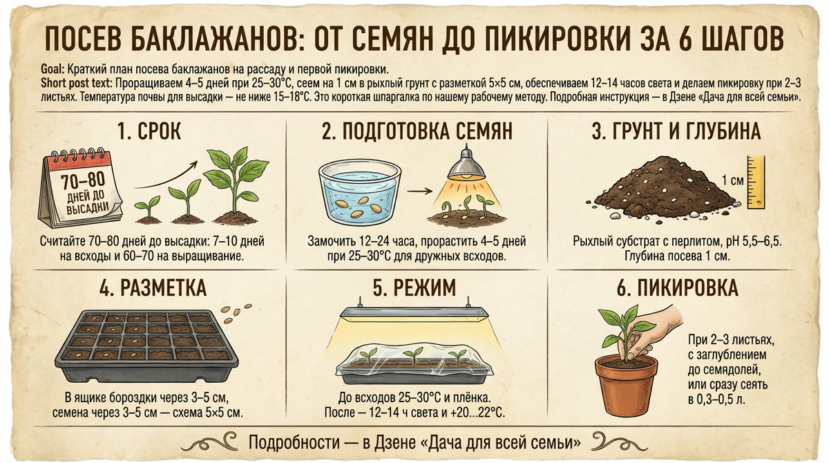 Лучший посев баклажанов на рассаду получается у нас так — семена проращиваем 4-5 дней в тёплой влажной марле при 25-30°C, сеем на глубину 1 см в рыхлый рассадный грунт, делаем разметку 5×5 см в общем ящике, а пикировку проводим при 2-3 настоящих листьях с углублением до семядолей. Если не хочется травмировать корни, сразу используем индивидуальные стаканы 0,3-0,5 л или торфяные таблетки и тогда пикировку пропускаем. Этот подход стабильно даёт крепкую рассаду баклажанов к сроку 60-70 дней от всходов без вытягивания и чёрной ножки.