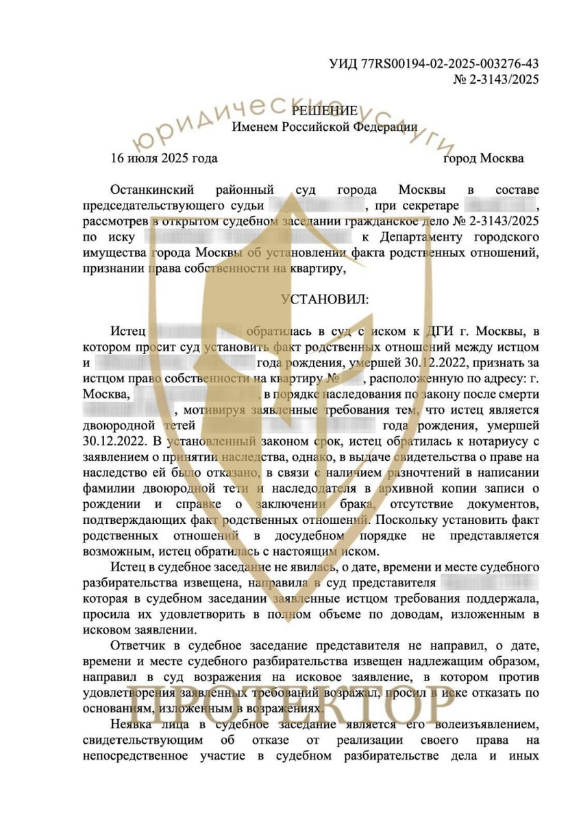 #успешныйкейс К нам обратился клиент, получивший отказ нотариуса в принятии наследства. Причина — разночтения в написании фамилии в документах, что мешало установить факт родственных отношений. Юристы «Протектора» разработали стратегию и подали иск к Департаменту городского имущества, чтобы признать права собственности в судебном порядке. Результат по решению суда: ✔️ Факт родственных отношений — установлен; ✔️ Право собственности в порядке наследования — признано в полном объеме. 🛡Итог: Несмотря на первоначальный отказ, законное право клиента на наследство было восстановлено через суд. Ищете решение сложной наследственной ситуации? Обращайтесь в ЮК ПРОТЕКТОР #Наследство #Право_Собственности #ПринятиеНаследства #ОтказНотариуса #ФактРодственныхОтношений #Иск